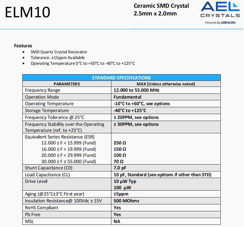 ELM10-16.000MHz-8-R60-2-D20-T | AEL Crystals | ELM10 | 16 MHz | ±20ppm | ±20ppm | 8 pF |