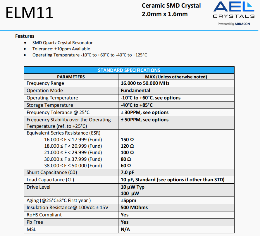 ELM11-32.000MHz-10-R60-D1X-T環(huán)保晶振,ELLS顯卡驅(qū)動(dòng)晶振,ELM11高精度晶振,美國(guó)AEL晶振公司,AEL晶振,無(wú)源晶振,ELM11晶振,ELM11-32.000MHz-10-R60-D1X-T晶振,2016晶振,四腳晶振,高精度晶振,高質(zhì)量晶振,貼片晶振,無(wú)源晶振,歐美晶振,小型晶振,汽車收音機(jī)晶振,車載多媒體晶振,工業(yè)設(shè)備晶振,環(huán)保無(wú)鉛晶振,石英晶振,高穩(wěn)定性晶振,醫(yī)療設(shè)備晶振,低損耗晶振。特點(diǎn):SMD石英晶體諧振器,公差:±10ppm,工作溫度0°C至+70°C至-55°C至+125°C。