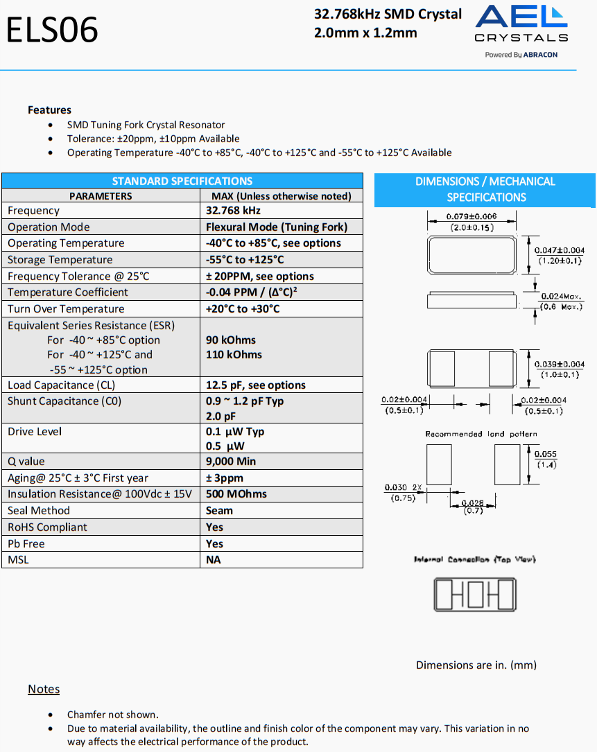 ELS07-32.768kHz-6-T | AEL Crystals | ELS07 | 32.768 kHz | 0 | ±20ppm | 6 pF |
