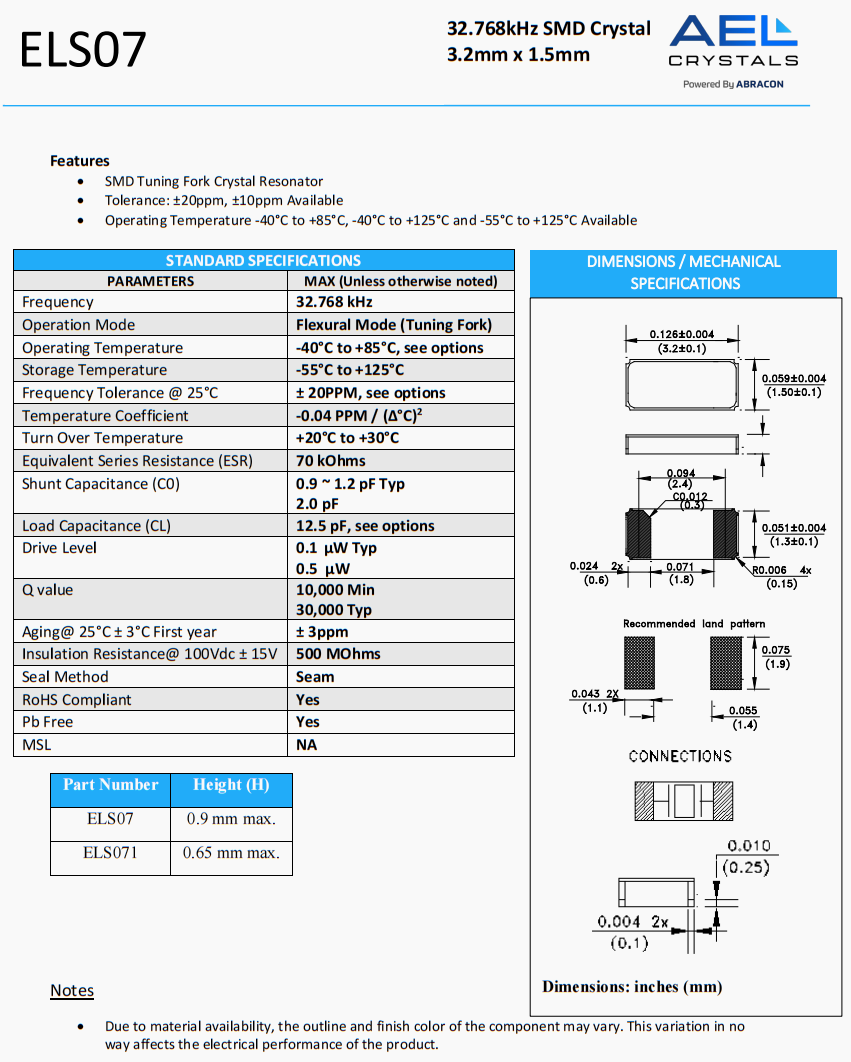 ELS07-32.768kHz-T | AEL Crystals | ELS07 | 32.768 kHz | 0 | ±20ppm | 12.5 pF |