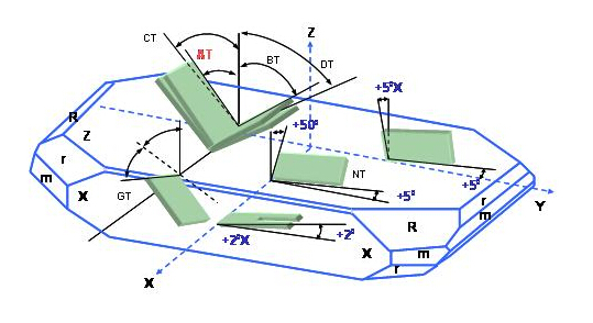 依據(jù)不同的應(yīng)用領(lǐng)域及工作溫度需求, 因應(yīng)了許多不同的石英切割角度種類(lèi). 例如AT-, BT-, CT-, DT-, NT, GT…..等不同的切割板片. 不同的切割方向的板片具有不同的彈性常數(shù)張量(elastic constant tensor), 不同的壓電常數(shù)張量(piezoelectric constant tensor)及不同的介電常數(shù)張量(dielectric constant tensor). 這些張量在石英組件的設(shè)計(jì)及應(yīng)用上展現(xiàn)了不同的振蕩及溫度特性. (圖中)表現(xiàn)了在Z-plat石英結(jié)構(gòu)上,幾種不同方向的石英板片切割方式.