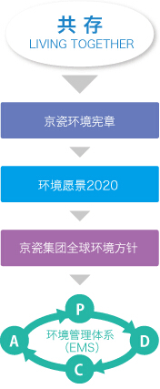 京瓷集團在“共存(LIVING TOGETHER)”這一理念的指導下,為構建低碳社會、循環型社會、與自然共存的社會,制定了《京瓷環境憲章》,其中規定了環保產品開發、節能、防止全球變暖、節約資源、削減廢棄物、化學物質的合理管理、保護生物多樣性等綜合性的環保措施.
