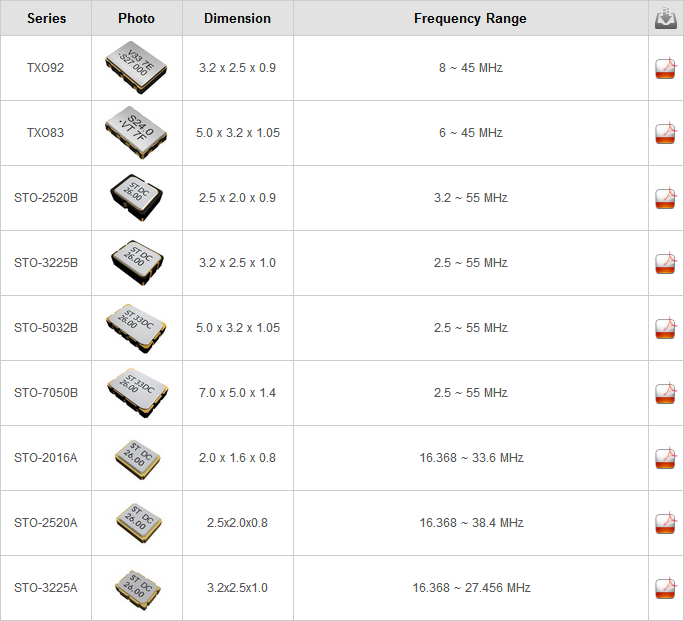 標稱頻率(MHz) | 8, 10, 12, 12.8, 13, 14.4, 16.368, 19.2, 19.8, 20, 24.5535, 26, 40 | ||