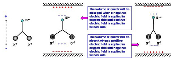 石英材料中的二氧化硅分子(SiO2) 在正常狀態下, 其電偶極是互相平衡的電中性. 在圖的二氧化硅是以二維空間的簡化圖形. 當我們在硅原子上方及氧原子下方分別給予正電場及負電場時, 空間系統為了維持電位平衡, 兩個氧原子會相互排斥, 在氧原子下方形成一個感應正電場區域, 同時在硅原子上方產生感應負電場區域. 相反的情況, 當我們在硅原子上方及氧原子下方分別給予負電場及正電場時, 兩個氧原子會相互靠近, 氧原子下方產生感應負電場,硅原子上方產生感應正電場. 然而, 氧原子的水平位置變化時, 鄰近的另一個氧原子會相對的產生排斥或吸引的力量, 迫使氧原子回到原來的空間位置. 因此, 電場的力量與原子之間的力量會相互牽動, 電場的改變與水平方向的形變是形成交互作用狀態. 這個交互作用會形成一個在石英材料耗能最小的振動狀態, 祇要由電場持續給與能量, 石英材料就會與電場之間維持一個共振的頻率. 這個壓電效應下氧原子的振幅與電場強度及電場對二氧化硅的向量角度有相對應的關系.在實際的應用上, 電場是由鍍在石英芯片上的金屬電極產生, 電場與二氧化硅的向量角度則是由石英晶棒的切割角度來決定.