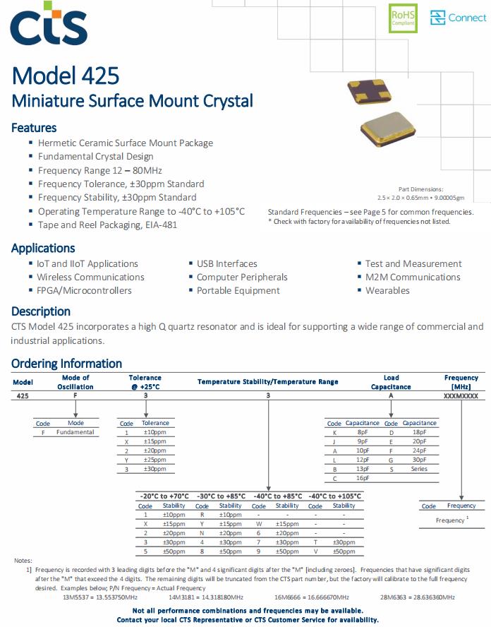425F22A025M0000 | CTS晶振 | 425 | MHz Crystal | 25MHz |