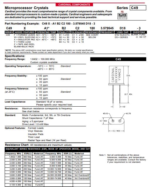 C49X-A1B2C2-60-29.0D16 | Cardinal晶振 | C49 | 29MHz | 16pF | ±50ppm | 60 Ohm | -20°C ~ 70°C |