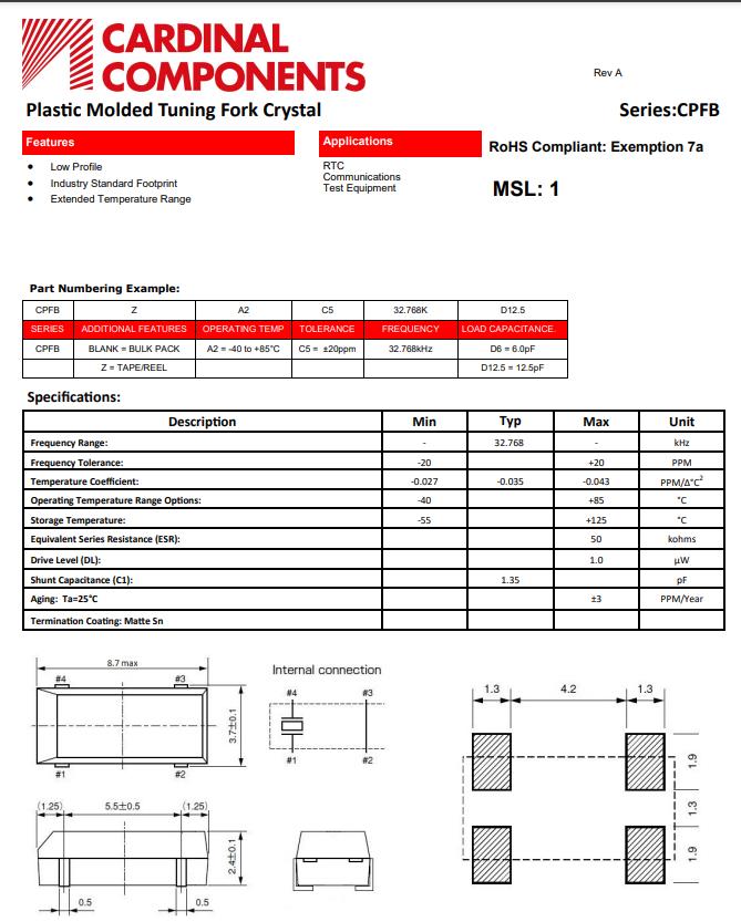 CPFBZ-A2C5-32.768KD12.5 | Cardinal晶振 | CPFB | 32.768kHz | 12.5pf | 20ppm | 50 kOhm | -40°C ~ 85°C |