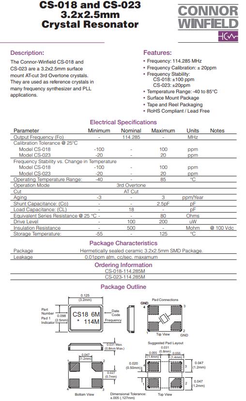 CS-018-114.285MHZ | Connor-Winfield | CS-018 | 114.285MHz | ±100ppm | ±100ppm | 18pF | 80 Ohm | -40°C ~ 85°C |