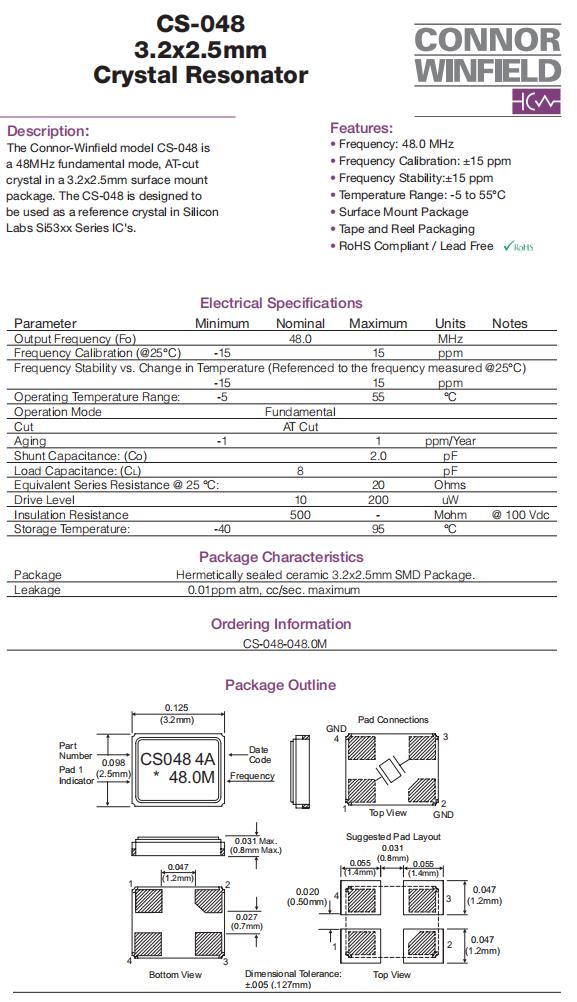 CS-043-048.0M | Connor-Winfield | CS-043 | 48MHz | ±25ppm | ±15ppm | 8pF | 20 Ohm | -40°C ~ 85°C |