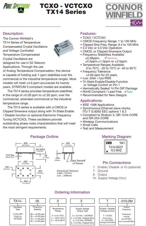 TX14-0523T-032.0M,TCXO長方形鐘振,6G無線通信晶振,Connor-Winfield晶振,TX14有源晶振,TX14-0523T-032.0M晶振,TCXO長方形鐘振,石英晶體振蕩器,頻率32MHz,電壓3.3V,工作溫度-40~85°C,頻率穩定性0.5ppm,低相噪晶振,高頻率穩定性晶振,6G無線通信晶振,IEEE 1588應用晶振,顯卡晶振,測試與測量設備晶振,以太網時鐘晶振.