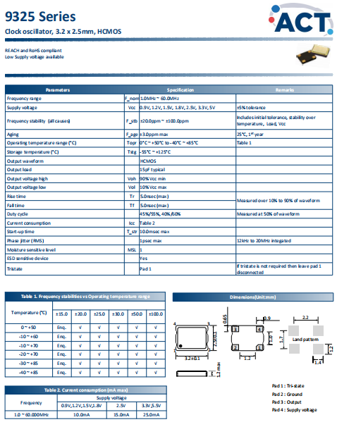 ACT晶振,9325晶振,SPXO振蕩器.3225mm體積非常小的SMDcrystal器件,是民用小型無線數(shù)碼產品的最佳選擇,小體積的晶振被廣泛應用到,手機藍牙,GPS定位系統(tǒng),無線通訊集,高精度和高頻率的穩(wěn)定性能,非常好的減少電磁干擾的影響,是民用無線數(shù)碼產品最好的選擇,符合RoHS/無鉛.