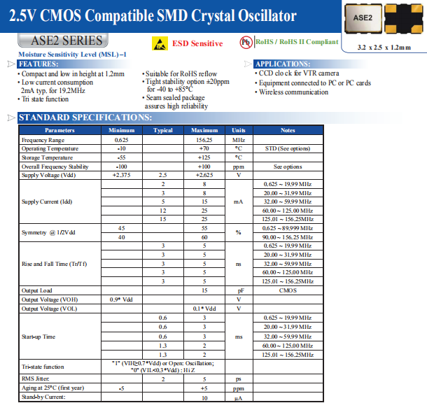 ABRACON晶振,ASE2-22.000MHZ-ET晶振,ASE2晶振,有源晶體振蕩器.3225mm體積非常小的SMDcrystal器件,是民用小型無線數碼產品的最佳選擇,小體積的晶振被廣泛應用到,手機藍牙,GPS定位系統,無線通訊集,高精度和高頻率的穩定性能,非常好的減少電磁干擾的影響,是民用無線數碼產品最好的選擇,符合RoHS/無鉛.