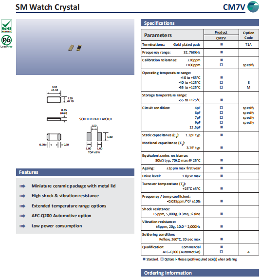 Golledge晶振,CM7V晶振,二腳貼片石英晶體.貼片石英晶振最適合用于車載電子領域的小型表面貼片石英晶體諧振器.也可對應有高可靠性要求的引擎控制用CPU的時鐘部分簡稱為時鐘晶體振蕩器,在極端嚴酷的環境條件下也能發揮穩定的起振特性,產品本身具有耐熱,耐振,耐撞擊等優良的耐環境特性,滿足無鉛焊接的回流溫度曲線要求,符合AEC-Q200標準.