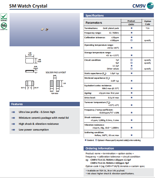Golledge晶振,CM9V晶振,1610石英晶體.32.768K系列具有超小型,薄型,質地輕的表面貼片音叉型石英晶體諧振器,晶振產品本身具備優良的耐熱性,耐環境特性,在辦公自動化,家電領域,移動通信領域可發揮優良的電氣特性,符合無鉛標準,滿足無鉛焊接的回流溫度曲線要求,金屬外殼的石英晶振使得產品在封裝時能發揮比陶瓷晶振外殼更好的耐沖擊性能.
