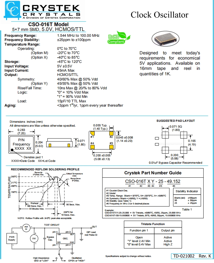 CRYSTEK晶振,CSO-016T晶振,高質(zhì)量有源振蕩器.貼片式石英晶體振蕩器,低電壓啟動功率,并且有多種電壓供選擇,比如有1.8V,2.5V,3.3V,3.8V,5V等,產(chǎn)品被廣泛應(yīng)用于,平板筆記本,GPS系統(tǒng),光纖通道,千兆以太網(wǎng),串行ATA,串行連接SCSI,PCI-Express的SDH/SONET發(fā)射基站等領(lǐng)域.符合RoHS/無鉛.