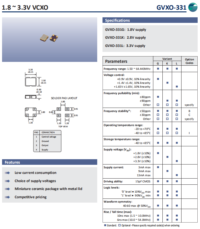 Golledge晶振,GVXO-331晶振,壓控晶體振蕩器.壓控晶振(VCXO)壓控石英晶體振蕩器基本解決方案,PECL輸出,輸出頻率60MHz到200MHz之間,出色的低相位噪聲和抖動,三態(tài)功能,應(yīng)用:SDH/SONET,以太網(wǎng),基站,筆記本晶振應(yīng)用,符合RoHS/無鉛.