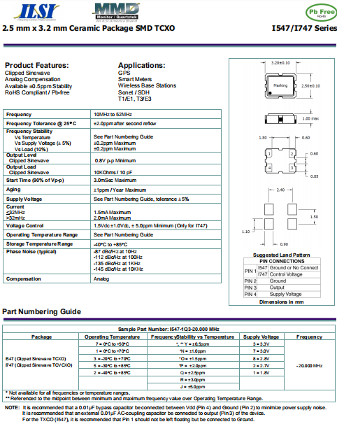 ILSI晶振,I547晶振,溫補(bǔ)振蕩器.有源晶振,是只晶體本身起振需要外部電壓供應(yīng),起振后可直接驅(qū)動(dòng)CMOS 集成電路,產(chǎn)品本身已實(shí)現(xiàn)與薄型IC(TSSOP封裝,TVSOP封裝)同樣的1mm厚度,斷開時(shí)的消費(fèi)電流是15 µA以下,編帶包裝方式可對(duì)應(yīng)自動(dòng)搭載及IR回流焊接(無鉛對(duì)應(yīng))產(chǎn)品有幾種電壓供選1.8V,2.5V,3V3.3V,5V,以應(yīng)對(duì)不同IC產(chǎn)品需要.