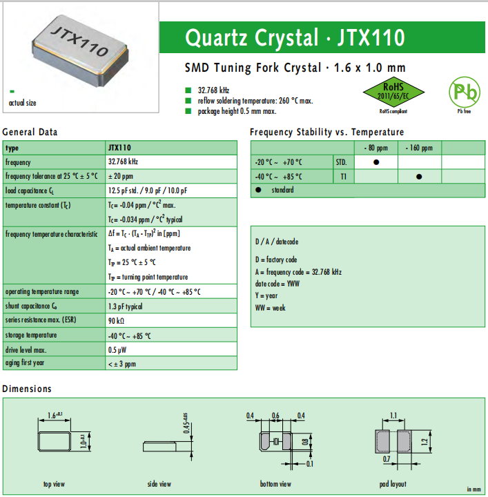 JAUCH晶振,JTX110晶振,無源環(huán)保晶體.小型貼片石英晶振,外觀尺寸具有薄型表面貼片型石英晶體諧振器,特別適用于有小型化要求的市場(chǎng)領(lǐng)域,比如智能手機(jī),無線藍(lán)牙,平板電腦等電子數(shù)碼產(chǎn)品.晶振本身超小型,薄型,重量輕,晶體具有優(yōu)良的耐環(huán)境特性,如耐熱性,耐沖擊性,在辦公自動(dòng)化,家電相關(guān)電器領(lǐng)域及Bluetooth,WirelessLAN等短距離無線通信領(lǐng)域可發(fā)揮優(yōu)良的電氣特性,滿足無鉛焊接的回流溫度曲線要求.