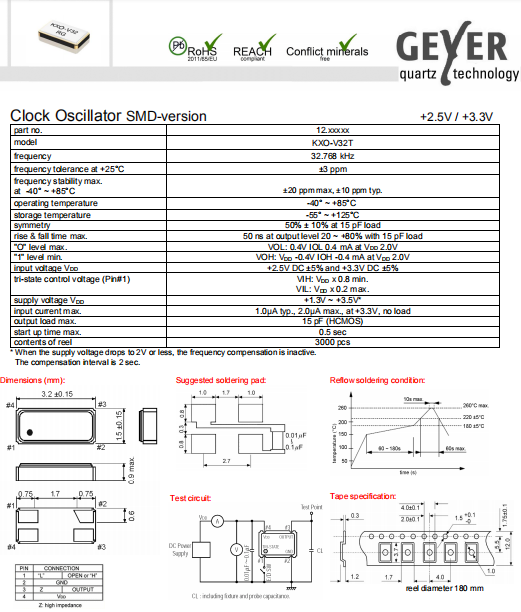 Geyer晶振,KXO-V32T晶振,時(shí)鐘晶體振蕩器.有源晶振,是只晶體本身起振需要外部電壓供應(yīng),起振后可直接驅(qū)動(dòng)CMOS 集成電路,產(chǎn)品本身已實(shí)現(xiàn)與薄型IC(TSSOP封裝,TVSOP封裝)同樣的1mm厚度,斷開時(shí)的消費(fèi)電流是15 µA以下,編帶包裝方式可對(duì)應(yīng)自動(dòng)搭載及IR回流焊接(無(wú)鉛對(duì)應(yīng))產(chǎn)品有幾種電壓供選1.8V,2.5V,3V3.3V,5V,以應(yīng)對(duì)不同IC產(chǎn)品需要.