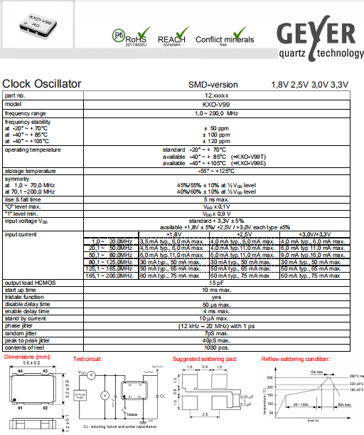Geyer晶振,KXO-V99晶振,有源晶體振蕩器.小型SMD有源晶振,從最初超大體積到現(xiàn)在的7050mm,6035mm,5032mm,3225mm,2520mm體積,有著翻天覆地的改變,體積的變小也使產品帶來了更高的穩(wěn)定性能,接縫密封石英晶體振蕩器,精度高,覆蓋頻率范圍寬的特點,SMD高速自動安裝和高溫回流焊設計,Optionable待機輸出三態(tài)輸出功能,電源電壓范圍:1.8V~5 V,高穩(wěn)定性,低抖動,低功耗,主要應用領域:無線通訊,高端智能手機,平板筆記本WLAN,藍牙,數(shù)碼相機,DSL和其他IT產品的晶振應用,三態(tài)功能,PC和LCDM等高端數(shù)碼領域,符合RoHS/無鉛.