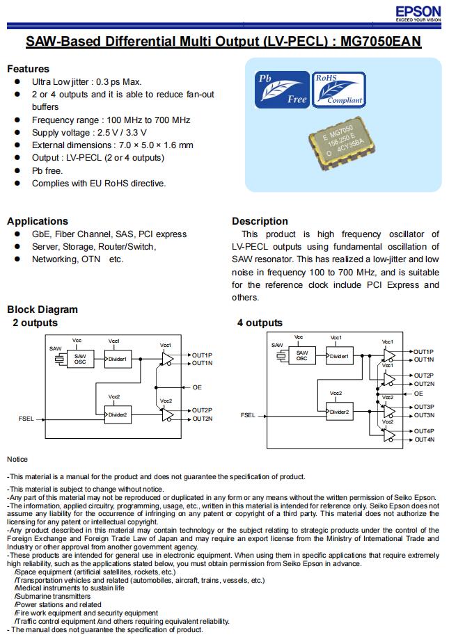 X1M0004110019,LV-PECL石英差分晶振,7050mm晶體振蕩器 ,日本愛普生晶振,MG7050EAN進口晶振,X1M0004110019有源晶振,石英晶體振蕩器,LV-PECL石英差分晶振,頻率200MHz,電壓3.3V,工作溫度-5~85°C,頻率穩定性50ppm,尺寸7050mm,超低抖動晶振,GbE晶振,光纖通道晶振,網絡服務器晶振,存儲晶振,路由器晶振,PCI express晶振.