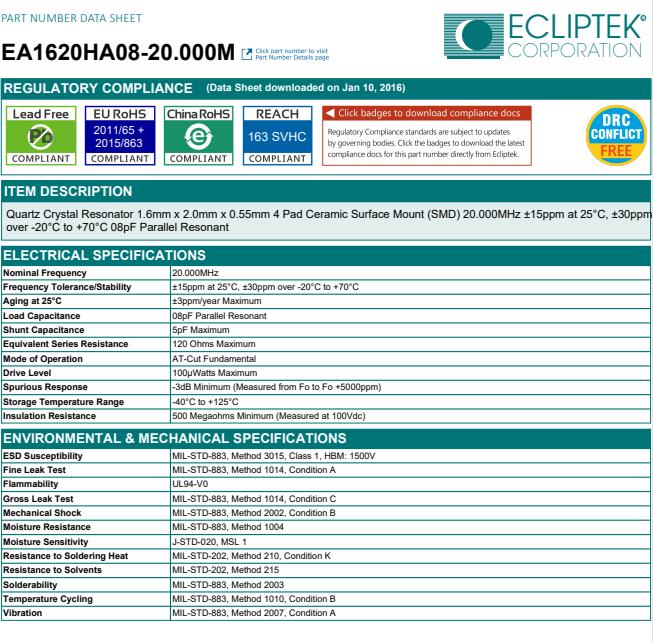 ECLIPTEK晶振,EA1620石英晶振,EA1620HA08-20.000M晶振,貼片晶振本身體積小,超薄型石英晶體振蕩器,特別適用于有目前高速發(fā)展的高端電子數(shù)碼產(chǎn)品,因?yàn)榫д癖旧硇⌒突枨蟮氖袌?chǎng)領(lǐng)域,小型,薄型是對(duì)應(yīng)陶瓷振蕩器(偏差大)和普通的石英晶體振蕩器(偏差小)的中間領(lǐng)域的一種性價(jià)比較出色的產(chǎn)品.產(chǎn)品廣泛用于筆記本電腦,無線電話,衛(wèi)星導(dǎo)航SSD,USB,Blu-ray等用途,符合無鉛焊接的高溫回流焊曲線特性.