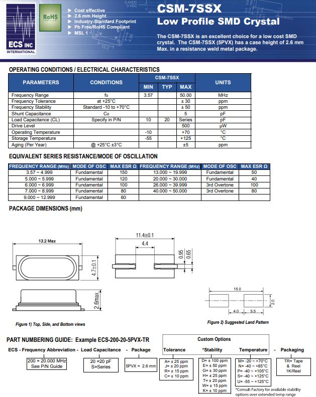 ECS-200-20-5PVX | CSM-7SSX | 20MHz | ±30ppm | 20pF | -10°C ~ 70°C | HC49/US |