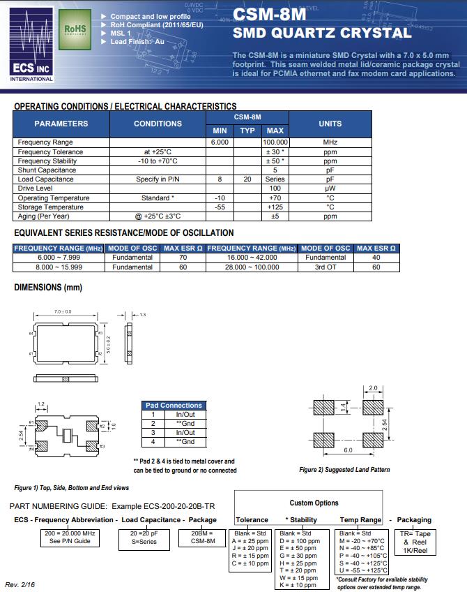 ECS-160-20-20BM-TR | CSM-8M | 16MHz | ±30ppm | 20pF | -10°C ~ 70°C |