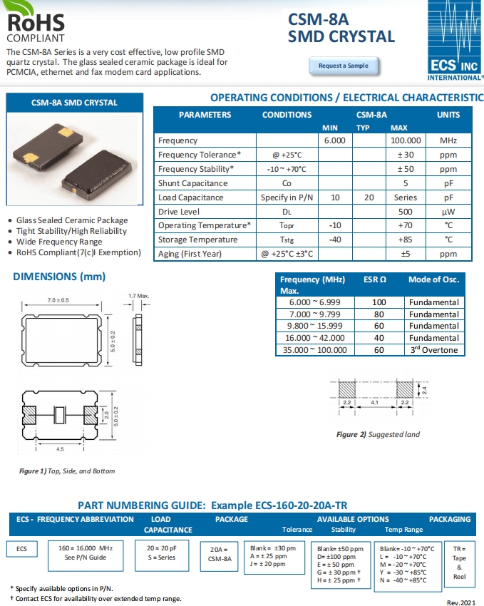 ECS-200-20-20A-TR\CSM-8A\20兆赫茲\7050mm\SMD晶體,尺寸7050mm,頻率為20MHZ,ECS晶振,美國伊西斯晶振,石英貼片晶振,進口無源諧振器,SMD晶體,石英晶體,石英晶體諧振器,音叉晶體,高質量晶振,低損耗晶振,7050mm貼片晶振,無線設備晶振,智能家居晶振,CSM-8A系列是一款非常具有成本效益的低規格貼片石英晶體。