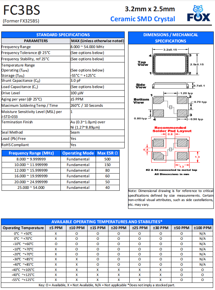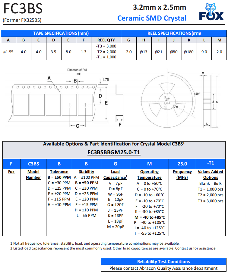 FC3BSBBLM25.0-T3 | Fox晶振 | FC3BS | 25 MHz | ±50ppm |