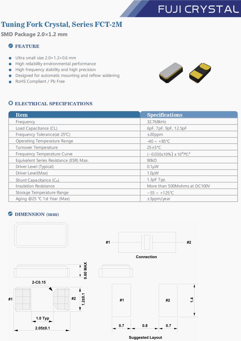 FCT2M032768C5Y5 | Fuji晶振 | FCT-2M | 32.768 kHz | 12.5pF | -40°C ~ 85°C |