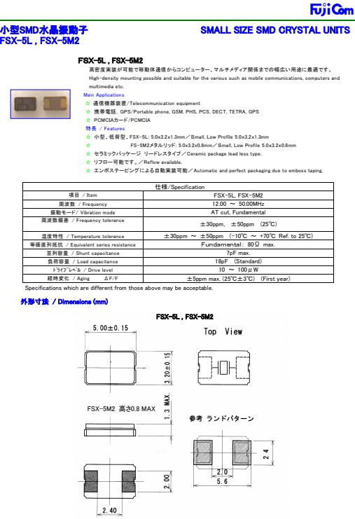 進(jìn)口富士晶振,FSX-5L晶振,FSX-5M2石英晶振,GSM專用晶振,小型表面貼片晶振型,是標(biāo)準(zhǔn)的石英晶體振蕩器,適用于寬溫范圍的電子數(shù)碼產(chǎn)品,家電電器及MP3,MP4,播放器,單片機(jī)等領(lǐng)域.可對(duì)應(yīng)8.000MHz以上的頻率,在電子數(shù)碼產(chǎn)品,以及家電相關(guān)電器領(lǐng)域里面發(fā)揮優(yōu)良的電氣特性,滿足無鉛焊接的回流溫度曲線要求.