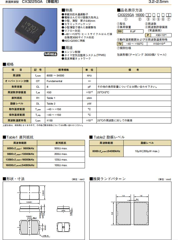 CX3225GA16000D0PTVCC | Kyocera晶振 | CX3225GA, Kyocera | MHz Crystal | 16MHz | -40°C ~ 150°C |