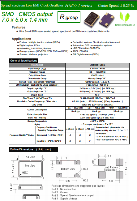 MERCURY晶振,臺產有源晶振,HM572R時鐘晶體振蕩器.貼片式石英晶體振蕩器,低電壓啟動功率,并且有多種電壓供選擇,比如有1.8V,2.5V,3.3V,3.8V,5V等,產品被廣泛應用于,平板筆記本,GPS系統,光纖通道,千兆以太網,串行ATA,串行連接SCSI,PCI-Express的SDH / SONET發射基站等領域.符合RoHS/無鉛.