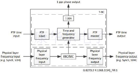 混合(PTP+SyncE)仿真模式可模擬本地振蕩器對單個T-BC或T-BC鏈的性能的影響.該模型假設混合T-BC,其中通過SyncE提供物理層頻率支持.該軟件實現了鎖定有源晶振狀態仿真.圖2顯示了G.8273.2中定義的T-BC模型.圖3顯示了在軟件中實現的T-BC的仿真模型.