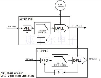 SyncE可以看作是T-BCPTP模塊的本地振蕩器.為了對PTPPLL建模,在SyncEPLL的情況下使用了相同的概念:關于本地振蕩器貢獻(SyncE輸出)的高通傳遞函數和關于PTP輸入貢獻的低通傳遞函數.