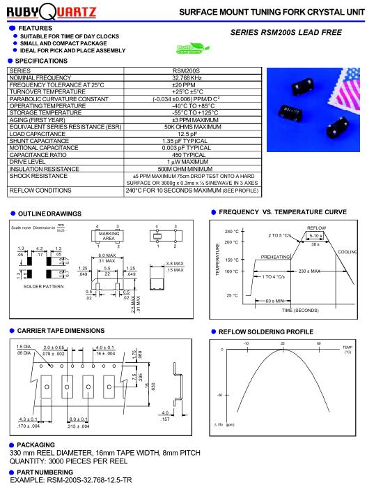 Rubyquartz高質(zhì)量晶振,RSM200S水晶振動子,RSM-200S-32.768-12.5-TR晶振,超小型、超低頻石英SMD晶振晶片的邊緣處理技術(shù):是超小型、超低頻石英晶振晶體元器件研發(fā)及生產(chǎn)必須解決的技術(shù)問題,為壓電石英晶振行業(yè)的技術(shù)難題之一.我公司康華爾電子具體解決的辦法是使用高速倒邊方式,通過結(jié)合以往低速滾筒倒邊去除32.768KHz晶振晶片的邊緣效應(yīng),在實際操作中機器運動方式設(shè)計、滾筒的曲率半徑、滾筒的長短、使用的研磨砂的型號、多少、填充物種類及多少等各項設(shè)計必須合理,有一項不完善都會使貼片無源晶振晶片的邊緣效應(yīng)不能去除,而石英晶振晶片的諧振電阻過大,用在電路中Q值過小,從而電路不能振動或振動不穩(wěn)定.