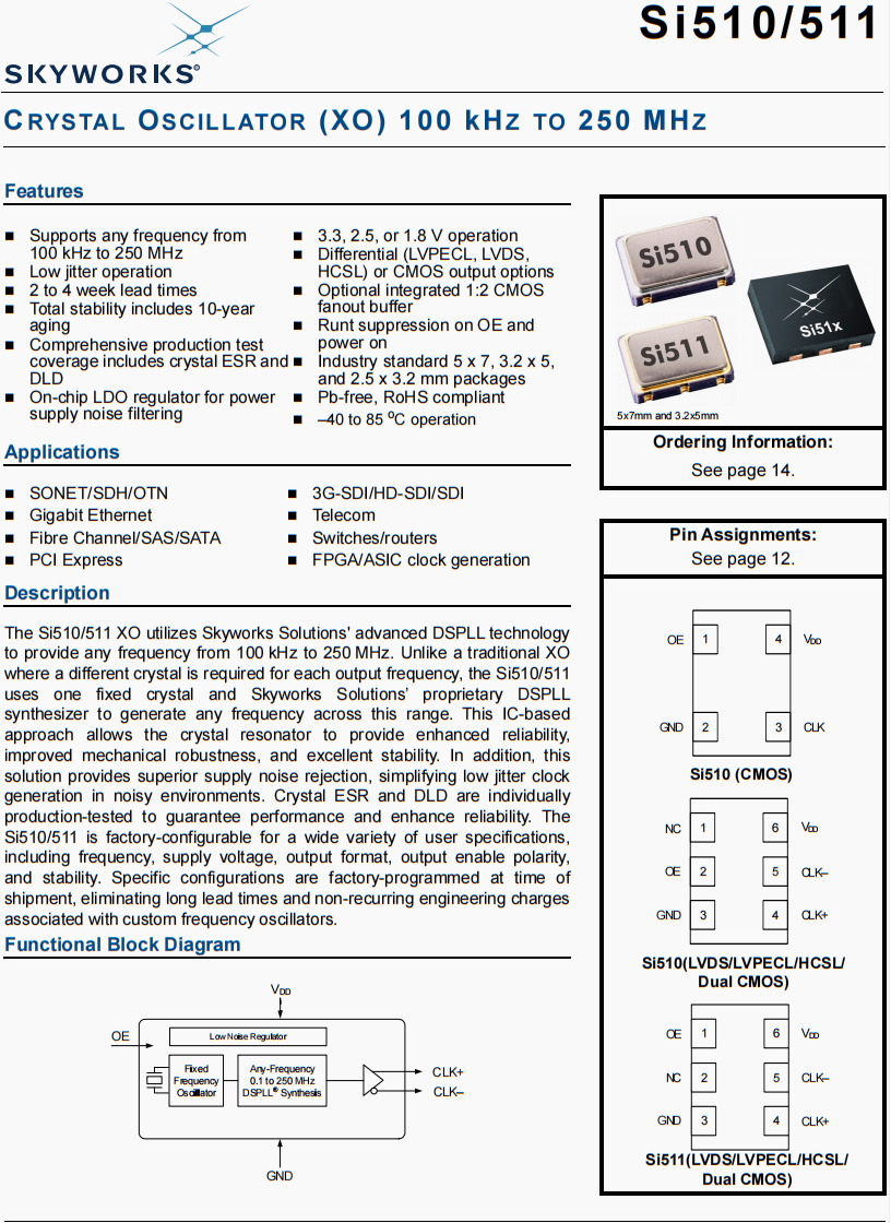 510FBA156M250BAG | Skyworks晶振 | Si510 | XO | 156.25 MHz | LVDS | 2.5V | ±25ppm |