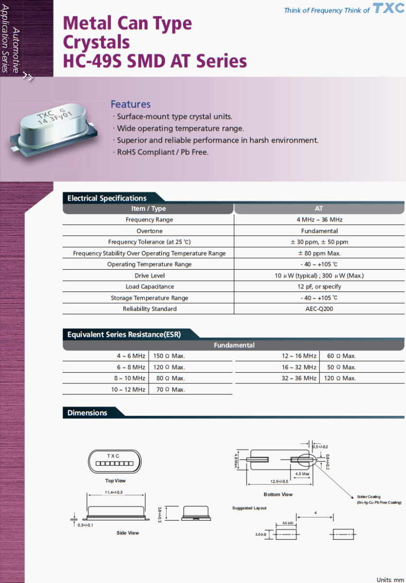 TXC晶振,AT-16.666MBGJ-T晶振,汽車空調(diào)控制面板晶振,臺(tái)灣TXC晶振公司,晶技晶振,臺(tái)灣晶振,進(jìn)口晶振,四腳晶振,AT-16.666MBGJ-T晶振,無(wú)源晶振,網(wǎng)絡(luò)設(shè)備晶振,汽車晶振,高品質(zhì)晶振,汽車氛圍燈晶振,大燈控制器晶振,小尺寸晶振,耐高溫晶振,金屬罐型,晶體, AT系列HC-49S SMD,特征,表面貼裝型晶體單元。工作溫度范圍寬。·惡劣環(huán)境下性能優(yōu)越可靠。符合RoHS標(biāo)準(zhǔn)/無(wú)鉛。