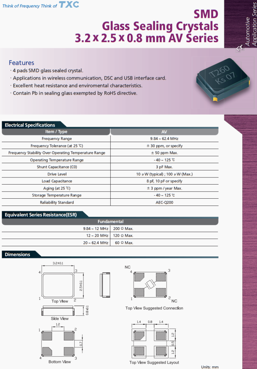 AV-25.000MAHQ-T | TXC晶振 | AV | 25MHz | ±30ppm | ±30ppm | 10pF |