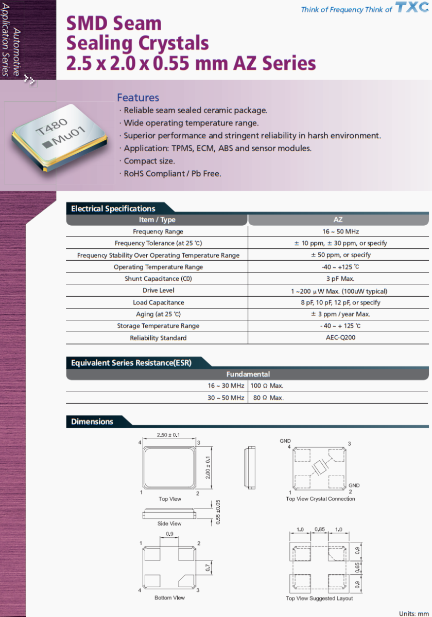TXC晶振,無鑰匙進入模塊晶振,AZ-37.400MEIQ-T晶振,臺灣TXC晶振公司,晶技晶振,AZ系列SMD接縫,密封晶體,2.5 x 2.0 x 0.55 mm ,特點,可靠的接縫密封陶瓷封裝。工作溫度范圍寬。性能優(yōu)越,在惡劣環(huán)境下具有嚴格的可靠性。應(yīng)用范圍:TPMS, ECM, ABS,傳感器模塊。.ompact大小。符合rohs標準/不含鉛,臺灣晶振,進口晶振,四腳晶振,無源晶振,網(wǎng)絡(luò)設(shè)備晶振,汽車晶振,高品質(zhì)晶振,汽車氛圍燈晶振,大燈控制器晶振,小尺寸晶振,耐高溫晶振,