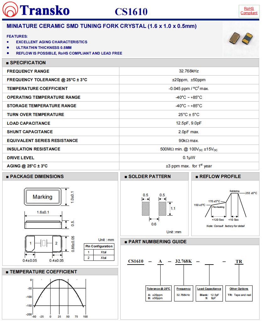 Transko無源晶振,CS1610-A-32.768K-9-TR,6G無線模塊晶振參數表