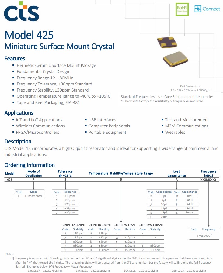425F11K025M0000 | CTS晶振 | 425 | MHz Crystal | 25MHz | 4-SMD, No Lead |