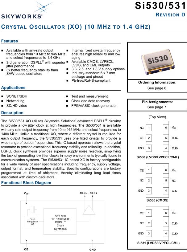 Si530/531 XO采用Skyworks Solutions的先進DSPLL®電路在高頻率下提供低抖動的時鐘。Si530/531可用與任意速率輸出頻率10到945 MHz和選擇頻率到1400 MHz。不像傳統的XO時鐘晶體振蕩器,需要不同的晶體每個輸出頻率,Si530/531使用一個固定晶體來提供一個輸出頻率范圍寬。這種基于集成電路的方法允許晶體諧振器提供卓越的頻率穩定性和可靠性。此外,DSPLL時鐘合成提供優越的電源噪聲抑制,簡化在噪聲環境中產生低抖動時鐘的任務通信系統。基于Si530/531 IC的XO是工廠配置的適用于各種用戶規格,包括頻率、電源電壓、輸出格式,且溫度穩定。特定的配置是工廠配置在裝船時編制程序,從而消除了漫長的交貨期與自定義振蕩器相關聯。