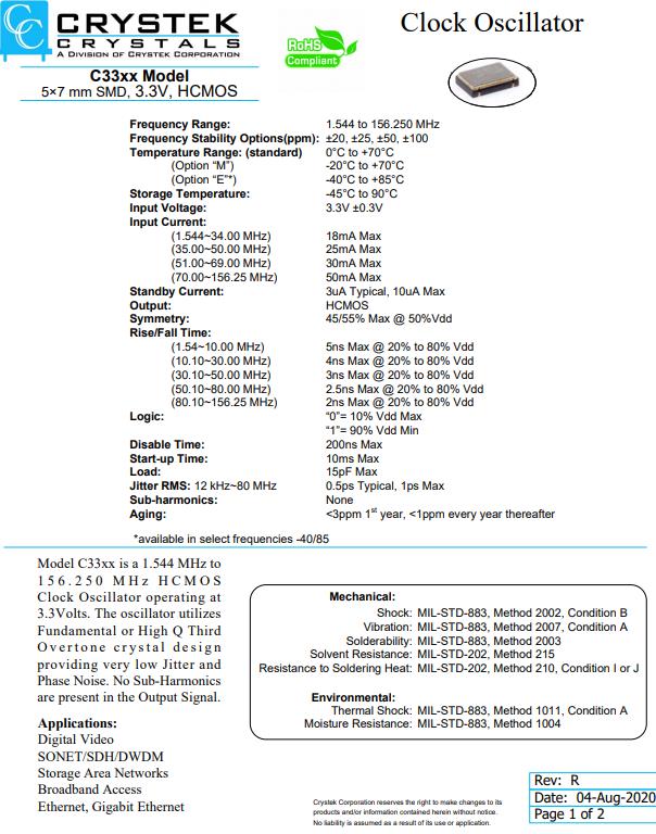 CE3390-33.000 | CRYSTEK晶振 | C33 | Active | XO (Standard) | 33MHz | ±100ppm | -40°C ~ 85°C |