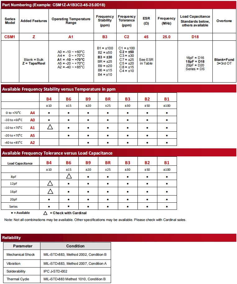 CSM1Z-A5B2C3-30-25.0D20 | Cardinal晶振 | CSM1 | MHz Crystal | 25MHz |