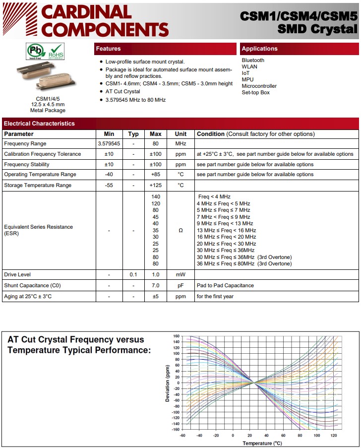 美國Cardinal卡迪納爾晶振CSM系列,晶振CSM1:13x4.7x4.6毫米,CSM4:13x4.7x3.5毫米,CSM5:13x4.7x3.0毫米,SMD晶體,兩腳貼片晶振,無源晶振,石英貼片晶振,石英晶體諧振器,無鉛環保晶振,薄型表面貼裝水晶,封裝是自動化表面安裝組裝和回流實踐的理想選擇,CSM1-4.6毫米;CSM4-3.5毫米;CSM5-3.0mm高,AT切割水晶,頻率范圍:3.579545MHz至80MHz。工作溫度范圍:-40℃至+85℃,該無源晶振應用于:藍牙,無線局域網,物聯網,最大功率放大器,微控制器,機頂盒。石英晶體CSM1Z-A5B2C5-60-24.0D18適用于無線局域網應用