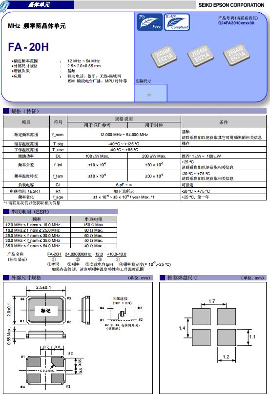 愛普生晶振FA-20H,小體積晶振尺寸2.5x2.0x0.55mm無源晶振,石英晶體諧振器,FA-20H額定頻率范圍12MHz~54MHz,負載電容:>6pF,存儲溫度:-40℃至+125℃,工作溫度:-40℃至+85℃(+105℃ )。主要用于移動電話,藍牙,無線-局域網,ISM 頻段電臺廣播,MPU時鐘等。FA-20H石英晶體諧振器金屬外殼封裝具有耐沖擊性,Q24FA20H0048500,SMD晶振