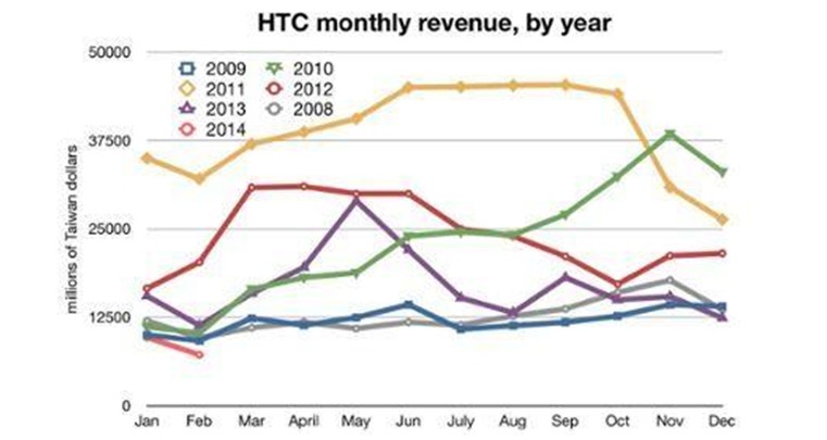 去年,HTC的營收是781.6億新臺幣,創(chuàng)2011年以來最低,并且不到2011年的17%。今年,按照前幾個月的趨勢,HTC有可能再創(chuàng)新低。