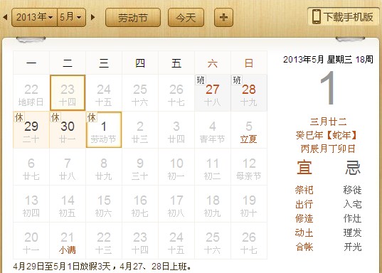 奉天承運(yùn),國家黨的安排,2013年5月1號(hào)勞動(dòng)節(jié)放假時(shí)間如下,4月29號(hào),30號(hào)-5月1號(hào),共三天。